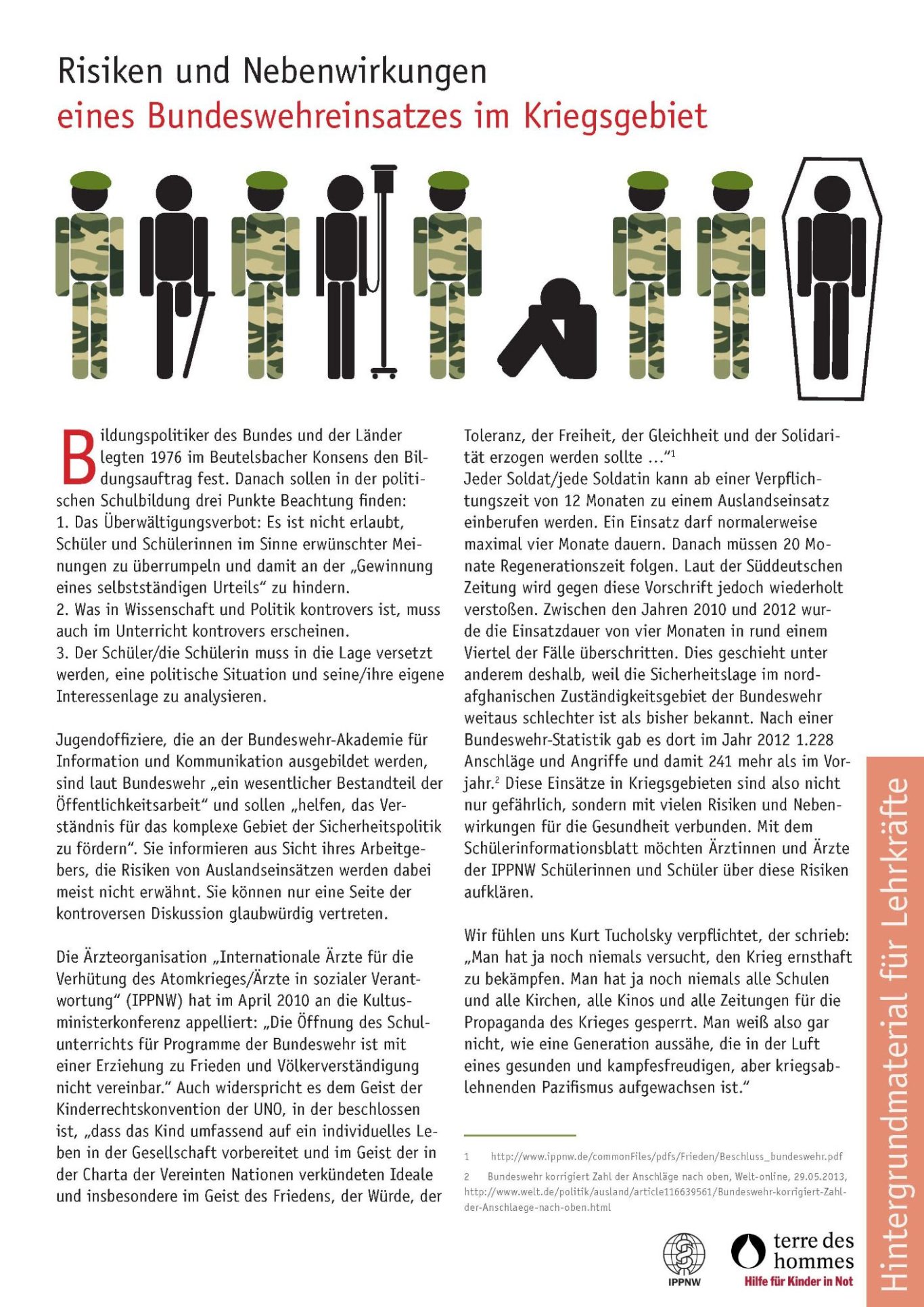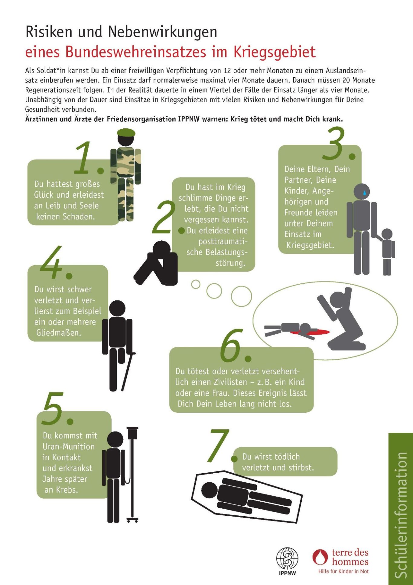 Egal wie lange – Auslandseinsätze bedeuten Einsätze in Kriegsgebieten. Sie bringen hohe Risiken und schwere Nebenwirkungen für Deine körperliche und seelische Gesundheit mit sich.